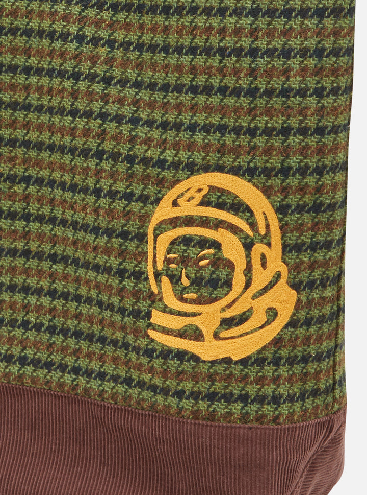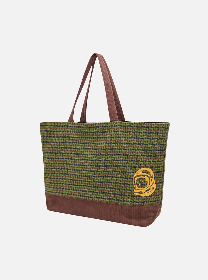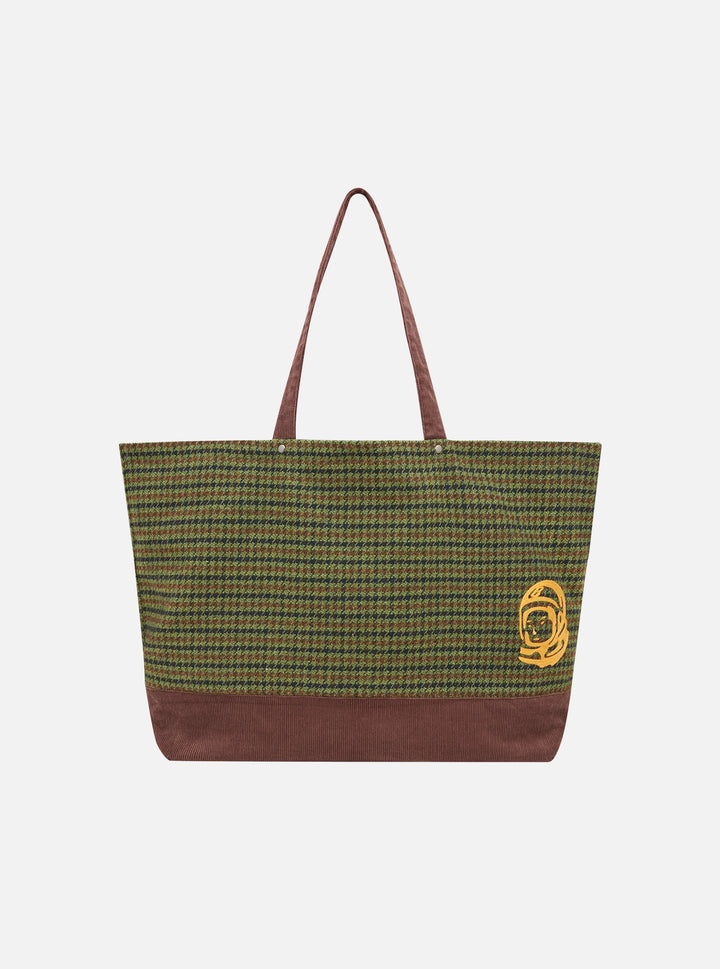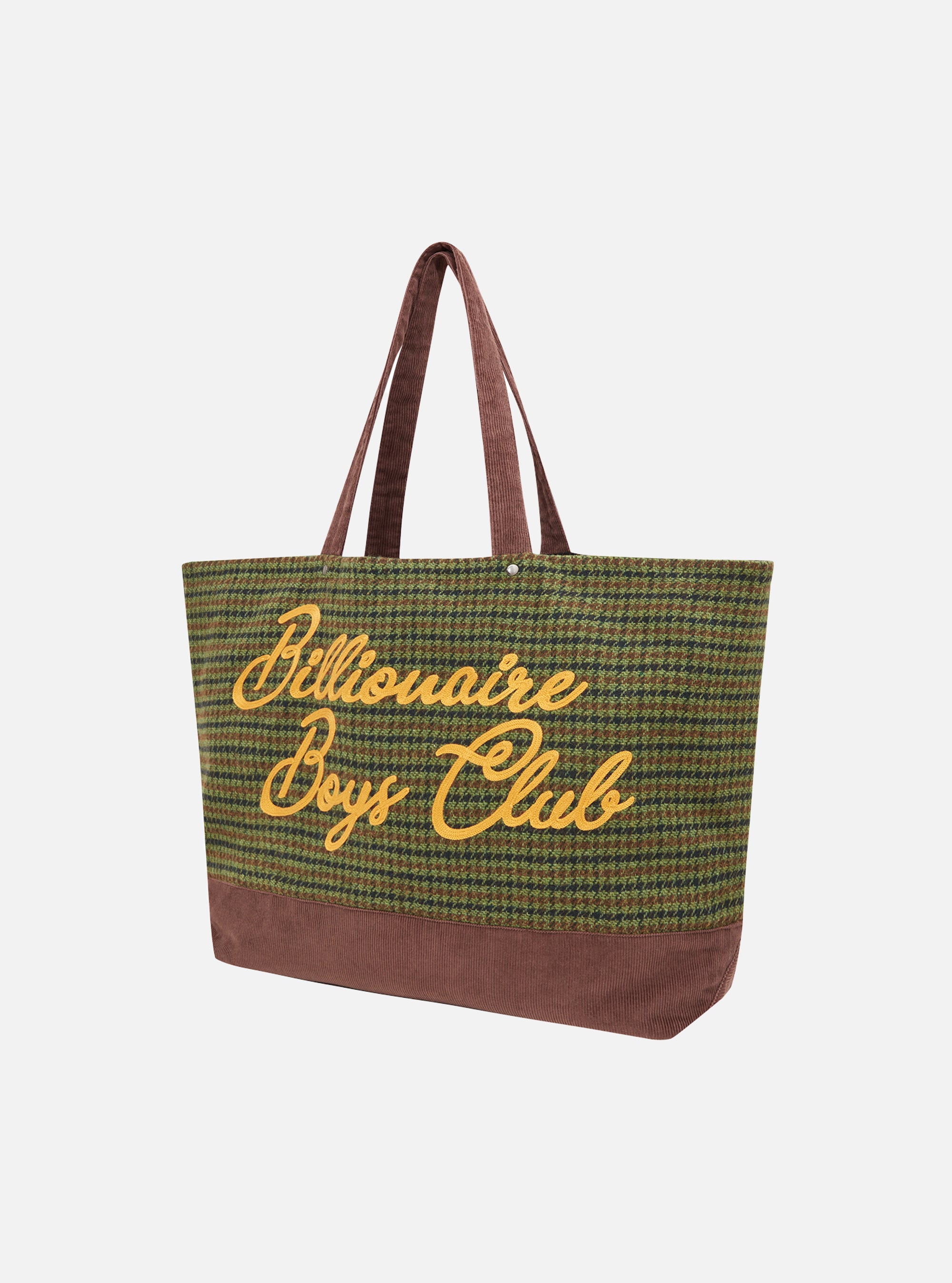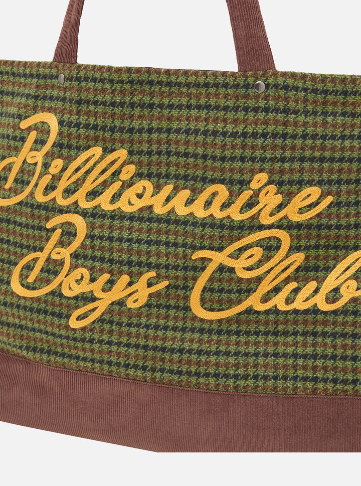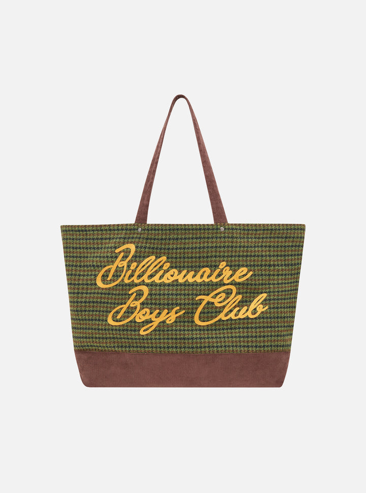 Bolsa en pata de gallo marrón y verde con las letras de Billionaire Boys Club en un color amarillo que encajan a la perfección
