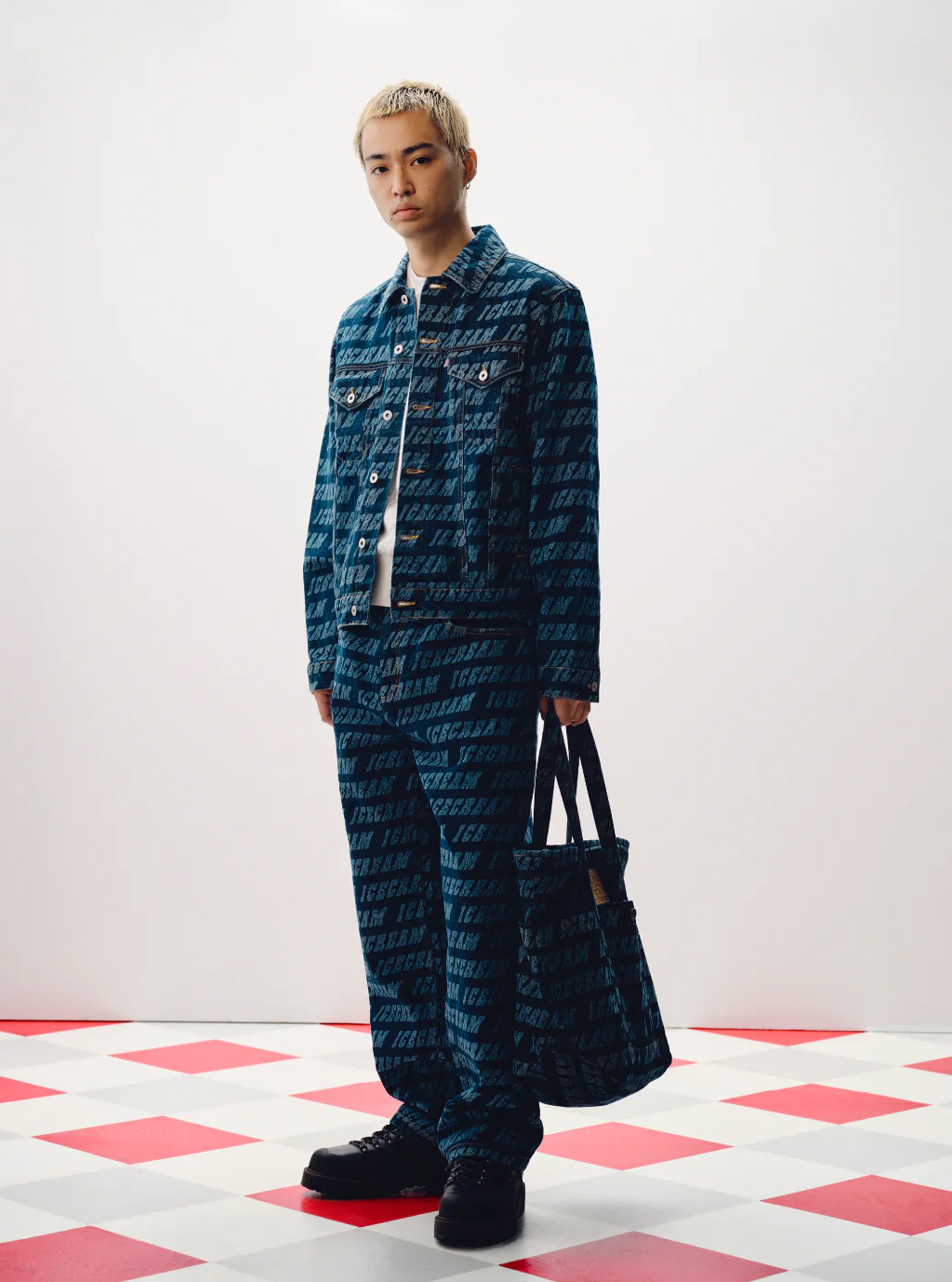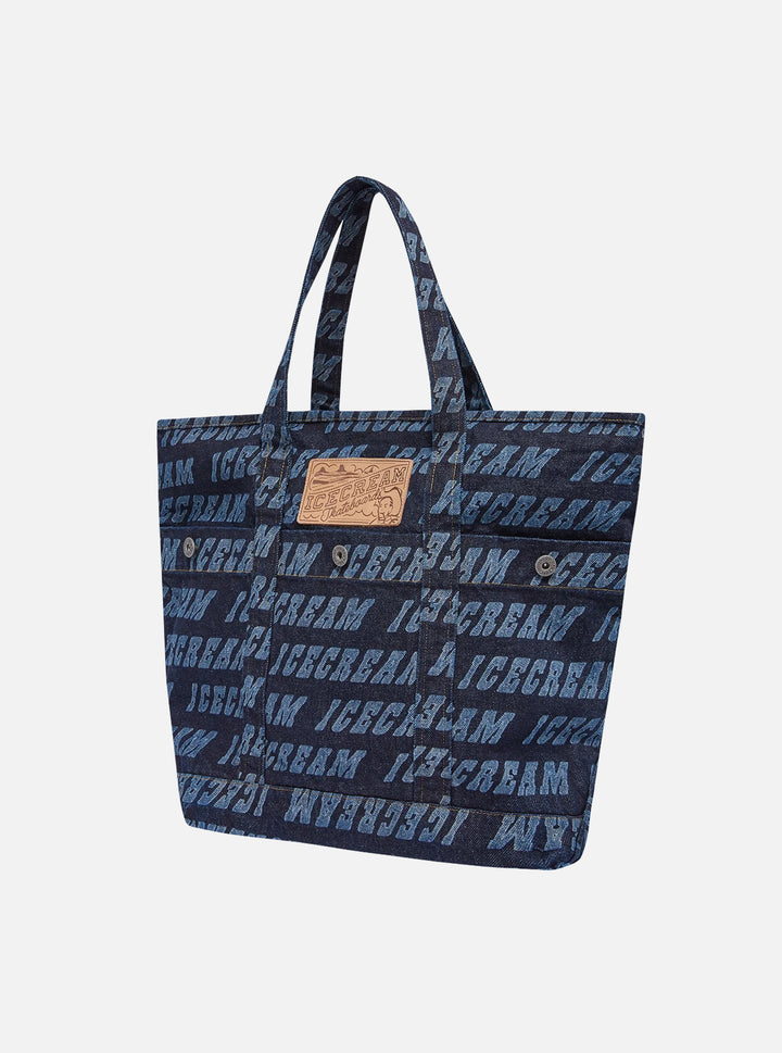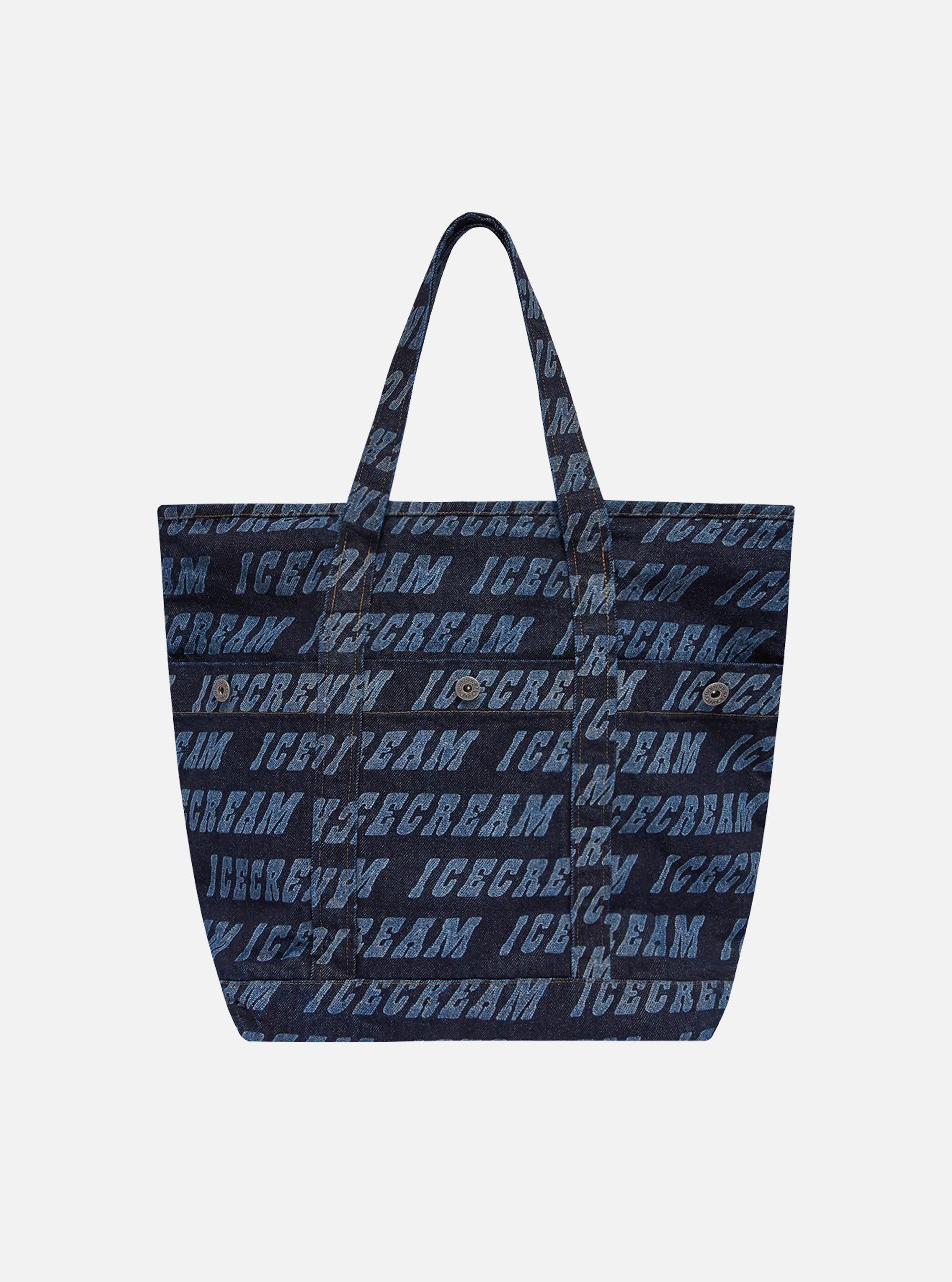 Bolso de mano con el logotipo de ICECREAM repetido por todas partes y una etiqueta de le marca en el frente.