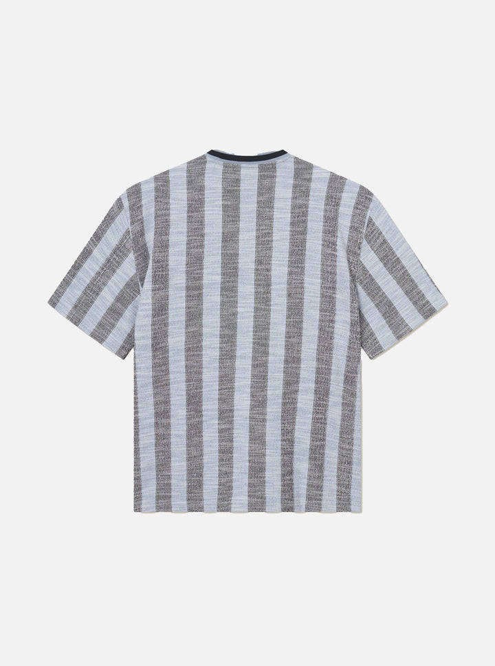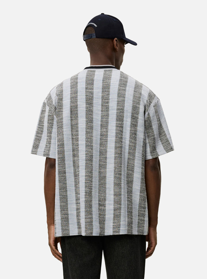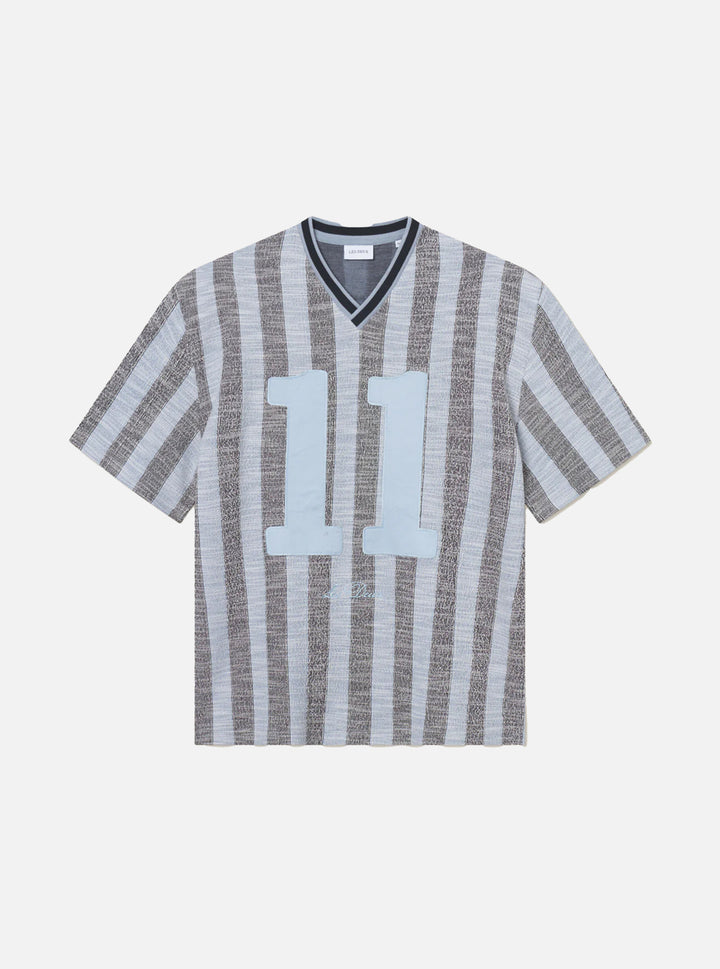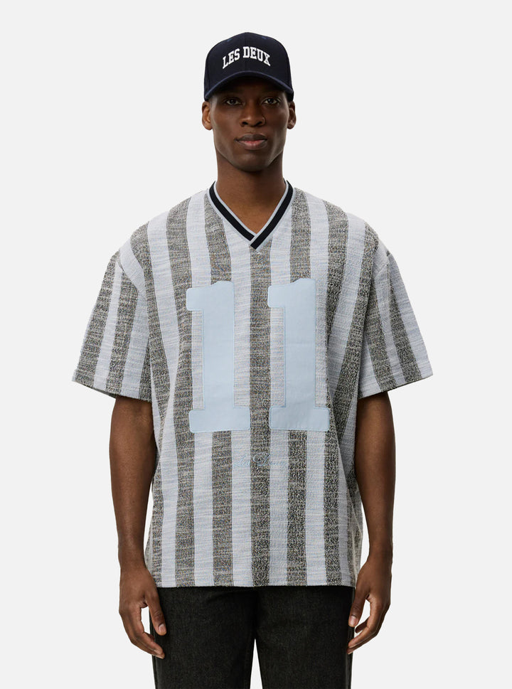 Una versión en jacquard a rayas de un clásico deportivo. La Bronson de Les Deux reinventa la camiseta de fútbol americano con una silueta cuadrada, textura tejida y logotipos gráficos en la parte delantera.