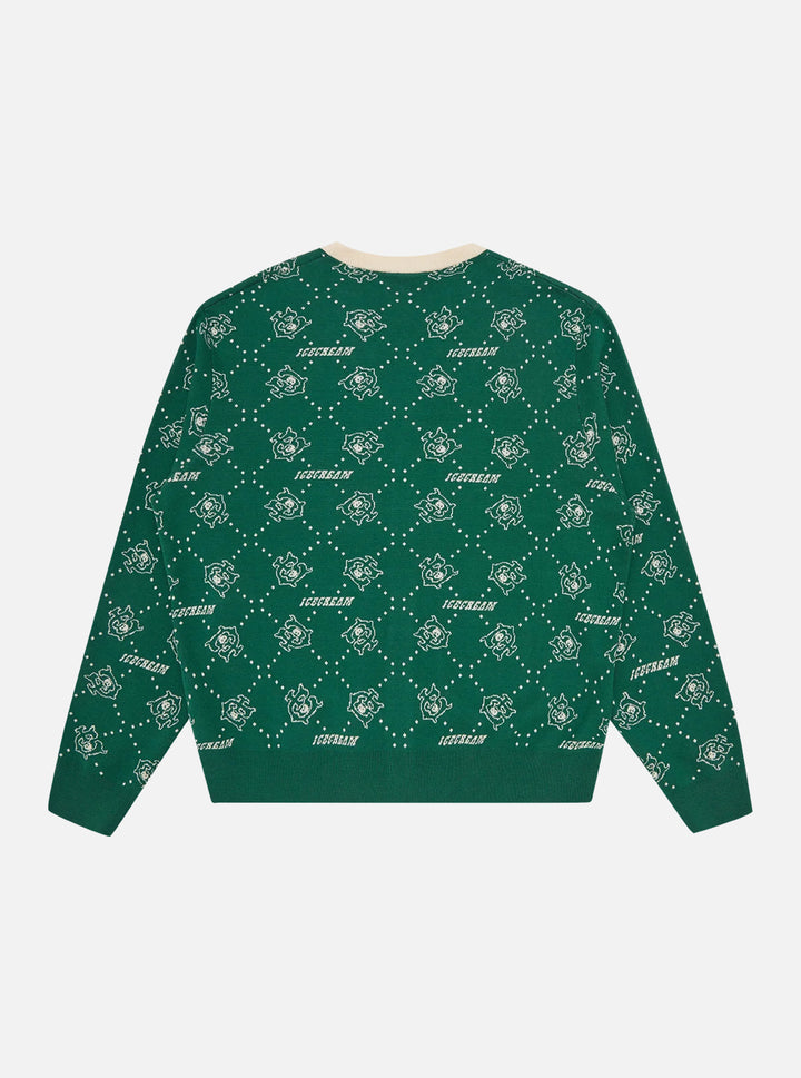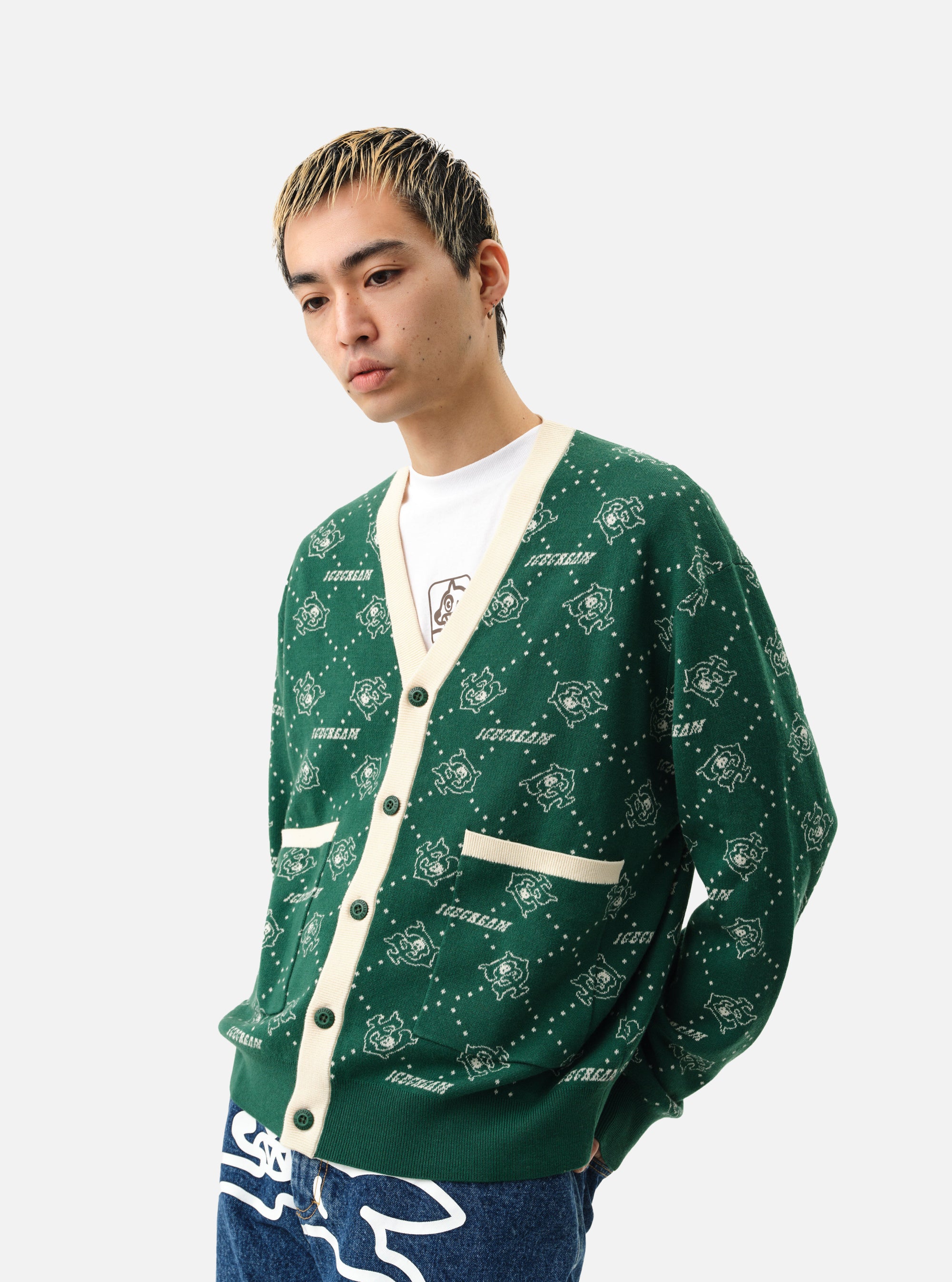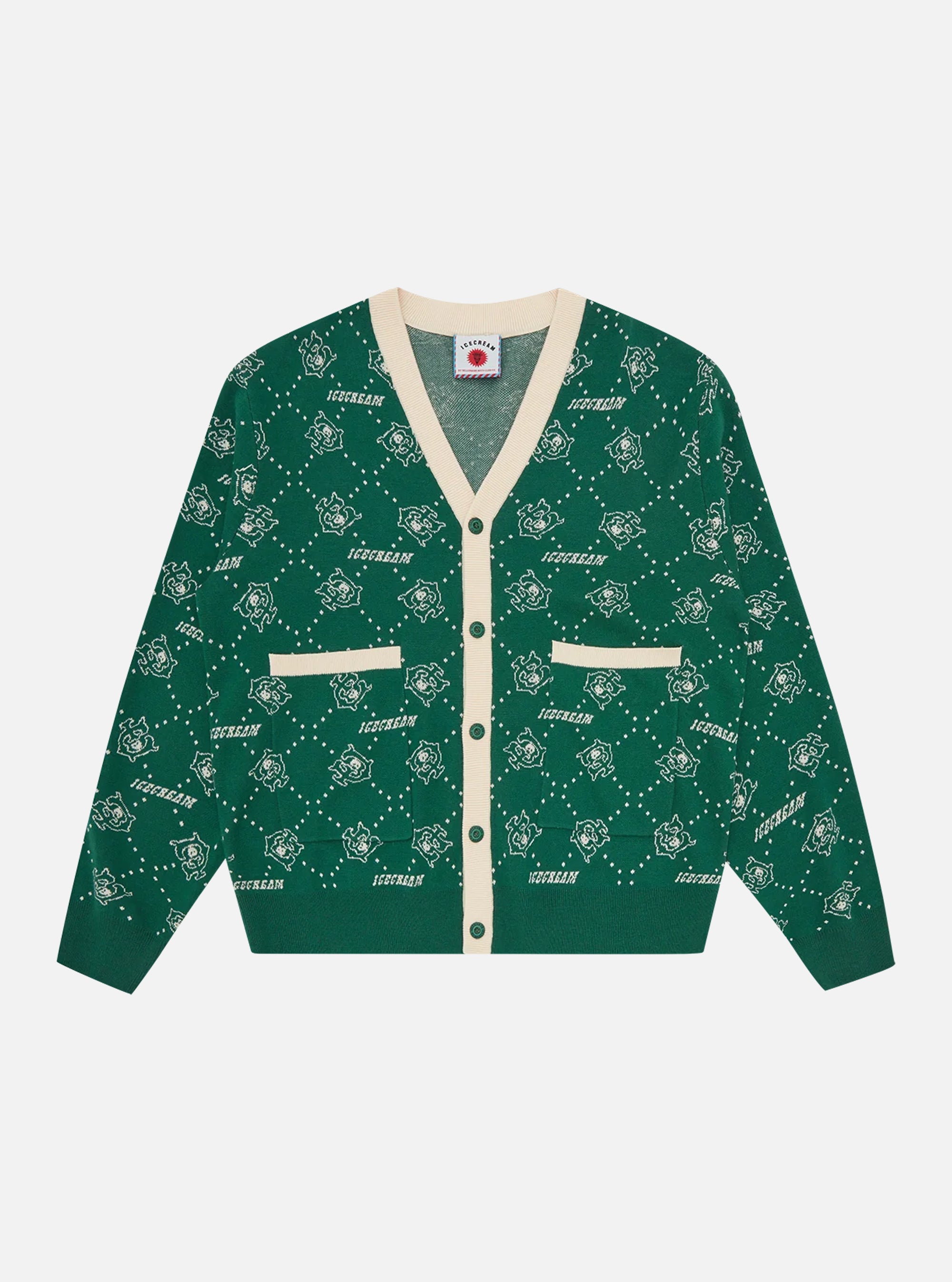 El cárdigan de punto verde presenta un monogram con el logo de la marca ICECREAM por toda la prenda.
