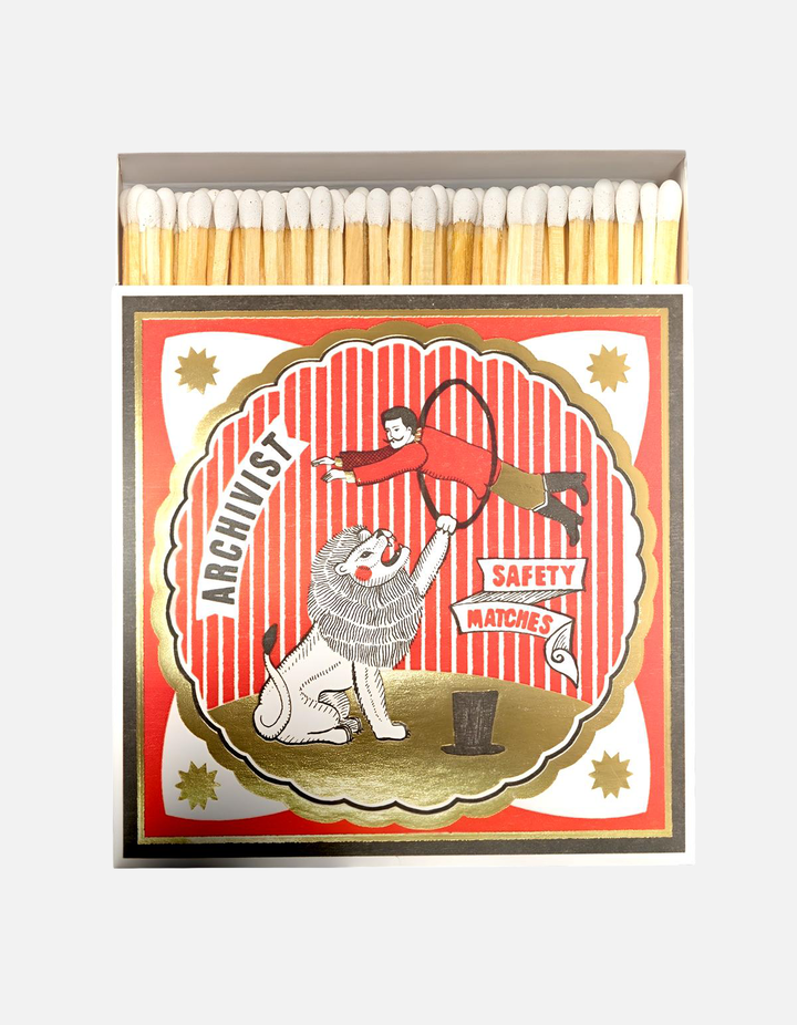 Esta exclusiva caja de cerillas cuadrada que presenta un artista de circo y un león con las palabras 'Archivist Safety Matches' y detalles en papel dorado..