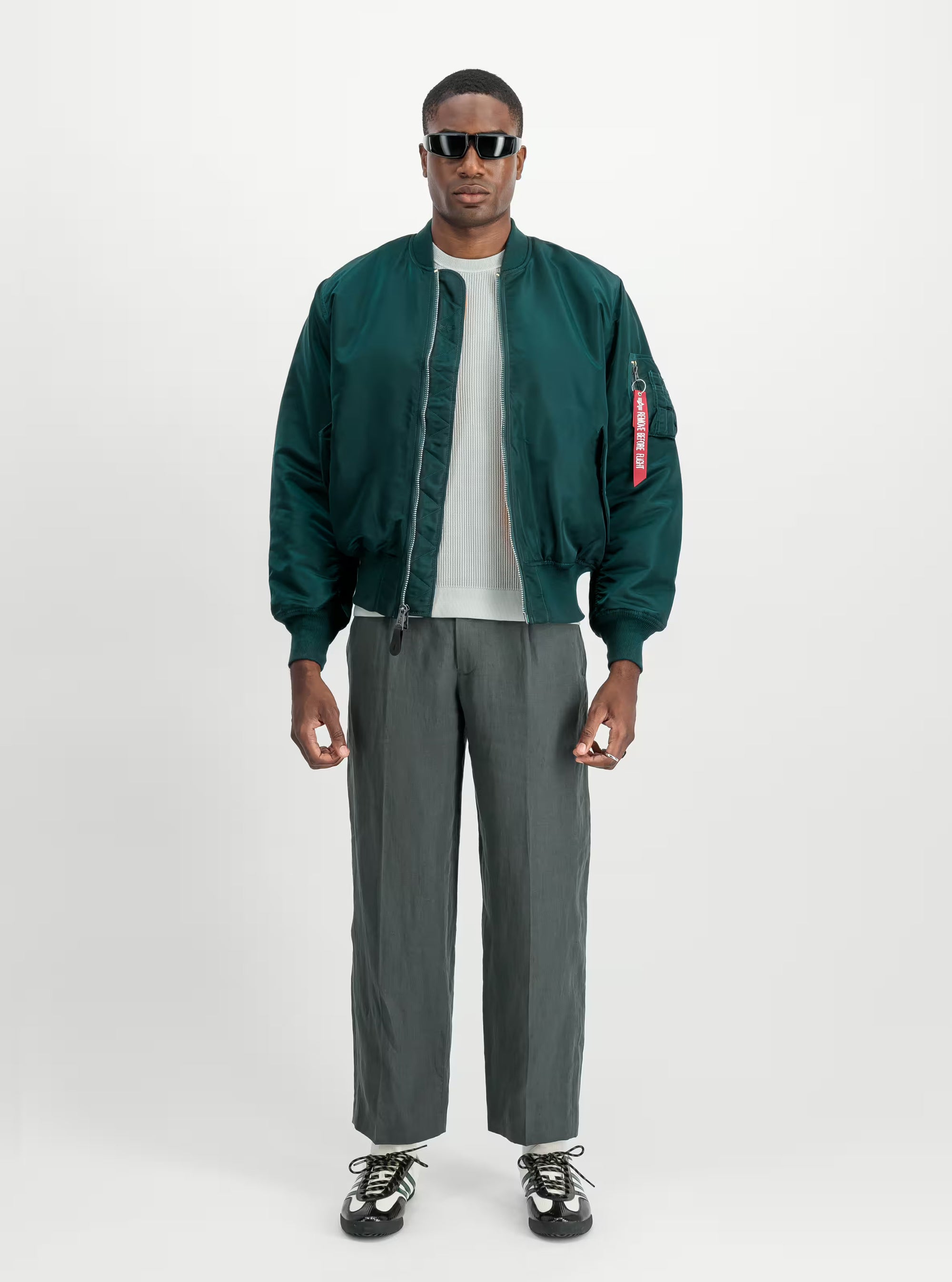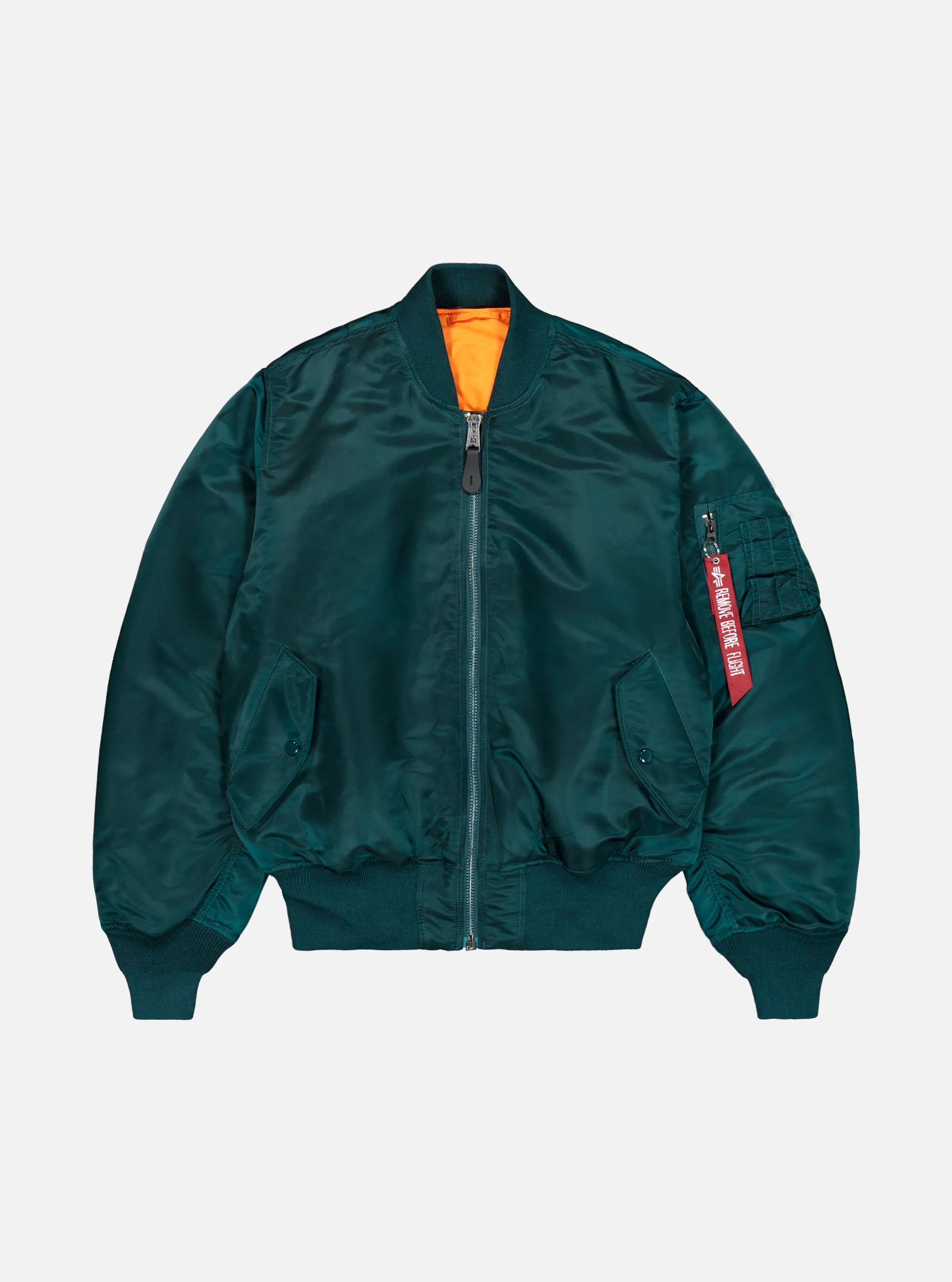 La chaqueta MA-1 también luce con orgullo el logotipo de Alpha cosido en la solapa del viento y una etiqueta de bandera en la manga izquierda, símbolos indiscutibles de calidad y autenticidad.