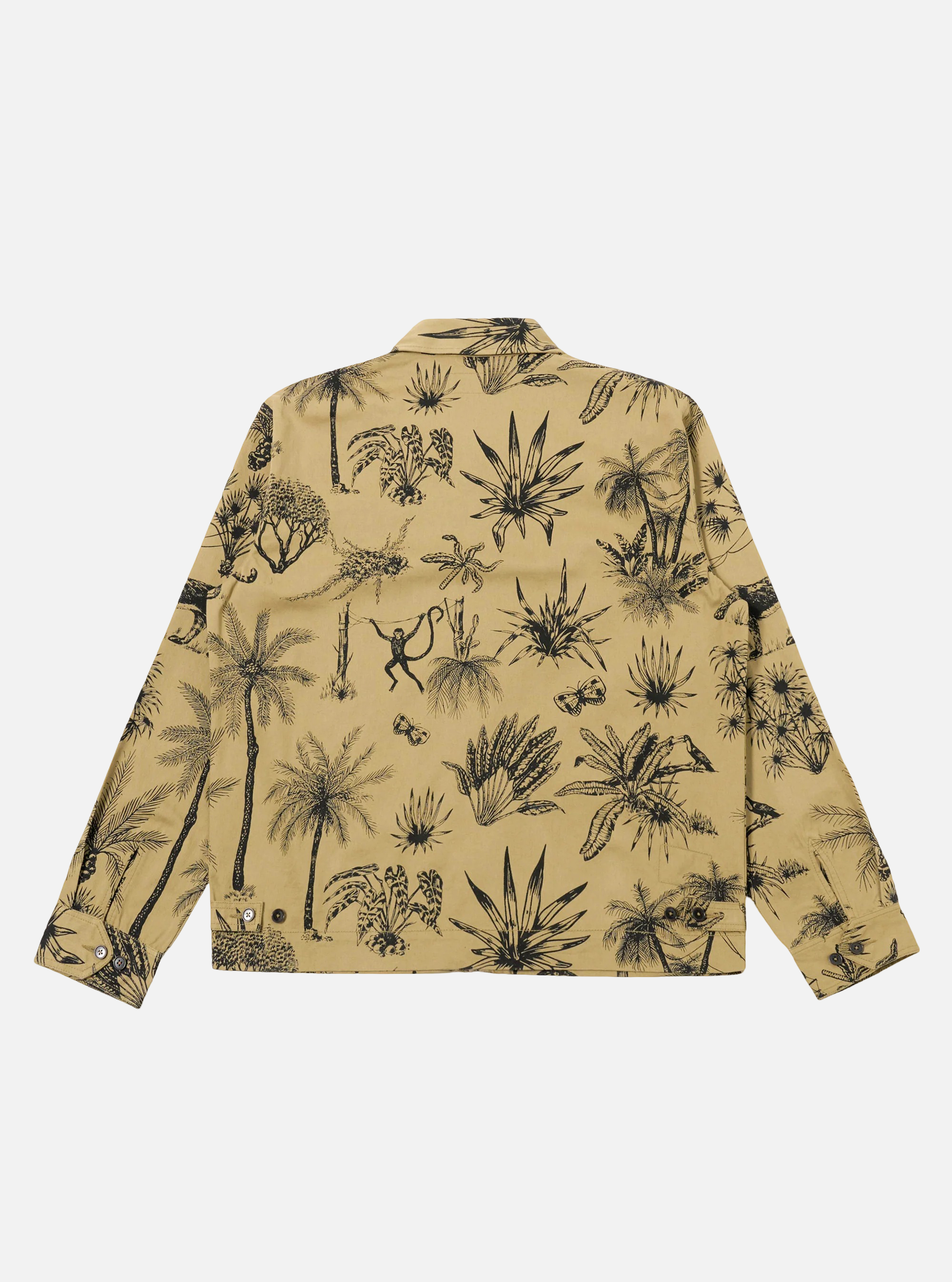 La chaqueta Windcheater Sand Jungle de Universal Works es una chaqueta de corte regular, con cierre frontal de doble dirección, cuello simple, puños ajustables con botones, lengüetas de ajuste en la cintura y tres bolsillos de ribete limpios.