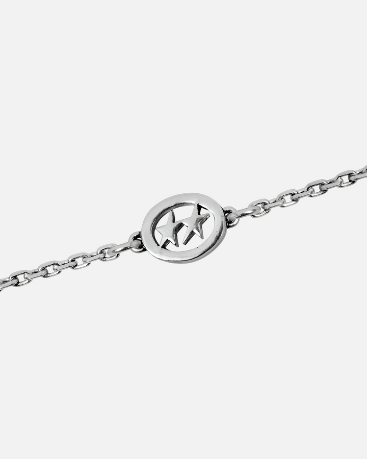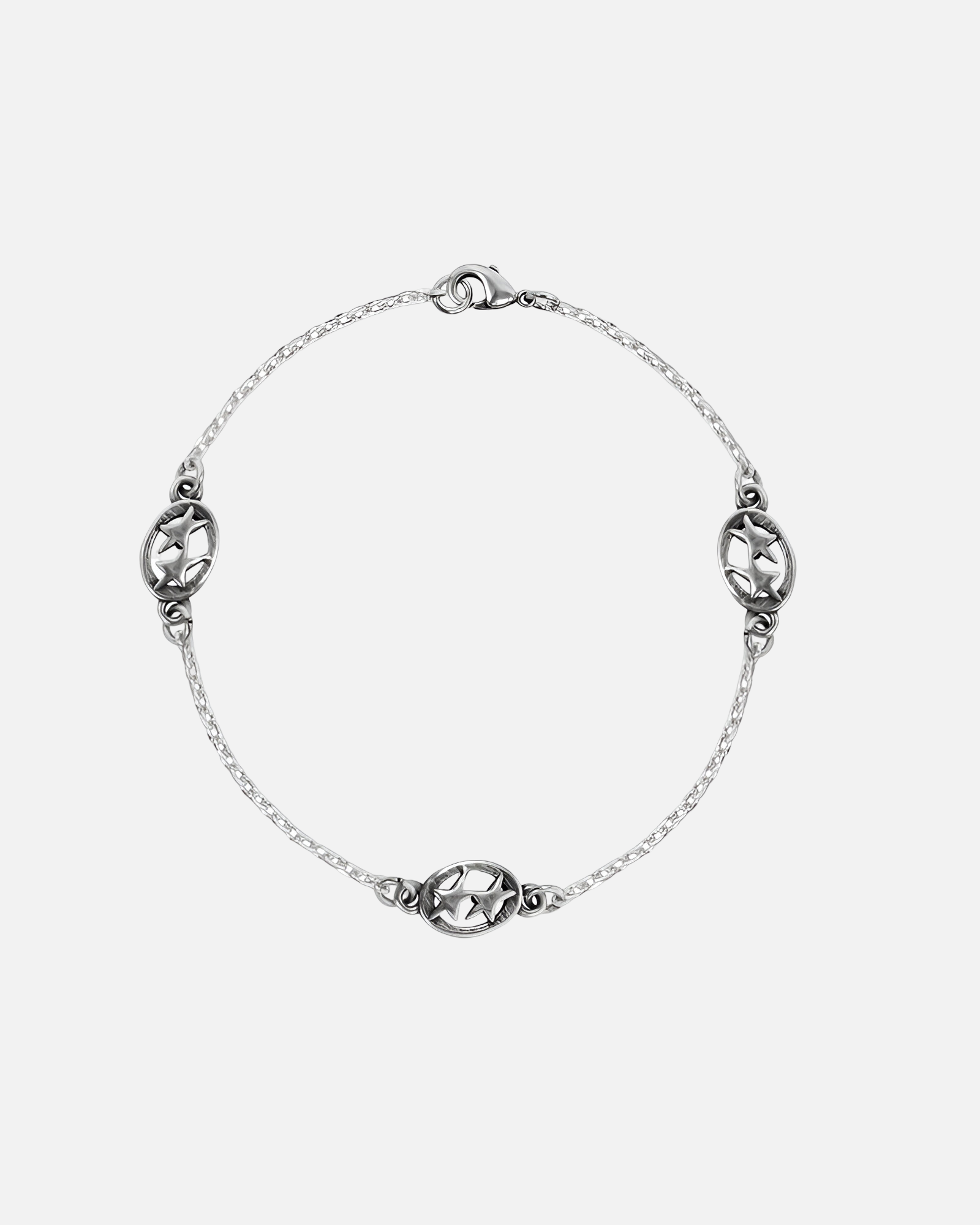 La pulsera Mini Superstar presenta tres logotipos icónicos a lo largo de la cadena con cierre de langosta