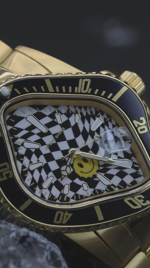Pero es la esfera la que se lleva todas las miradas: una fascinante espiral de cuadrados blancos y negros que se mueven en espiral hacia adentro con un movimiento hipnótico, creando una ilusión óptica que atrae la mirada y desafía las convenciones. En el centro de la espiral se encuentra un emoji sonriente deformado: un detalle lúdico e inesperado que aporta actitud e ironía a la elegancia escultural del reloj.