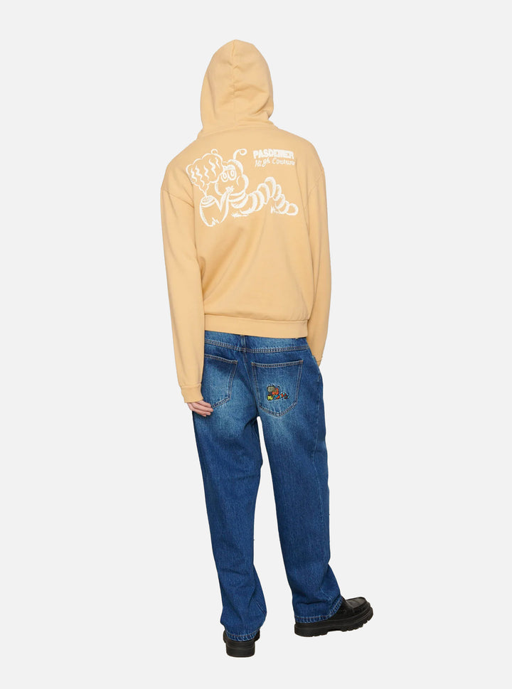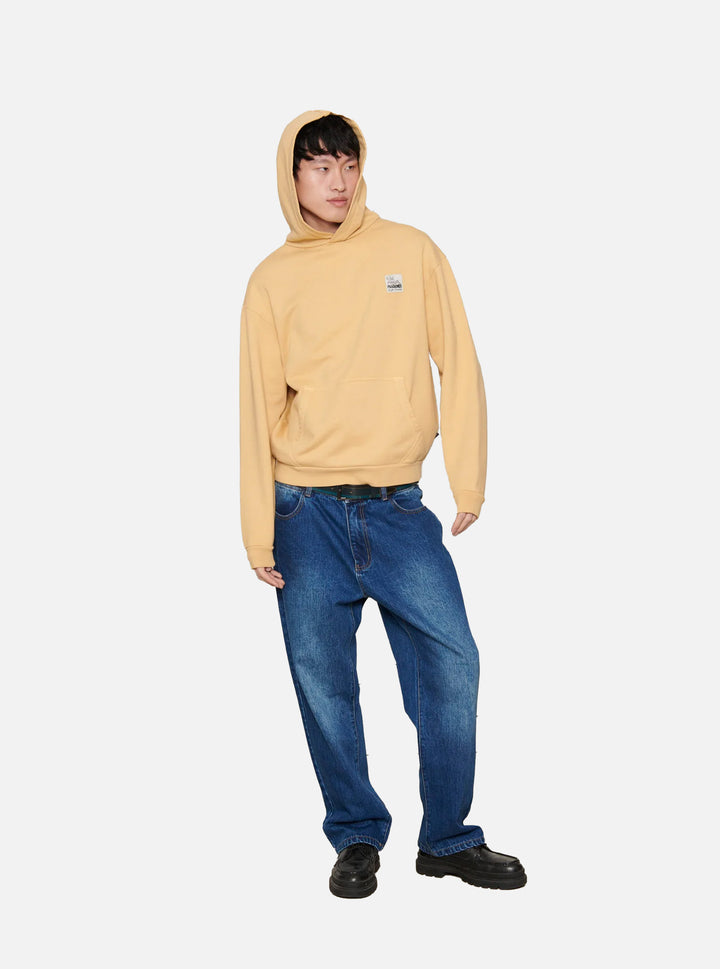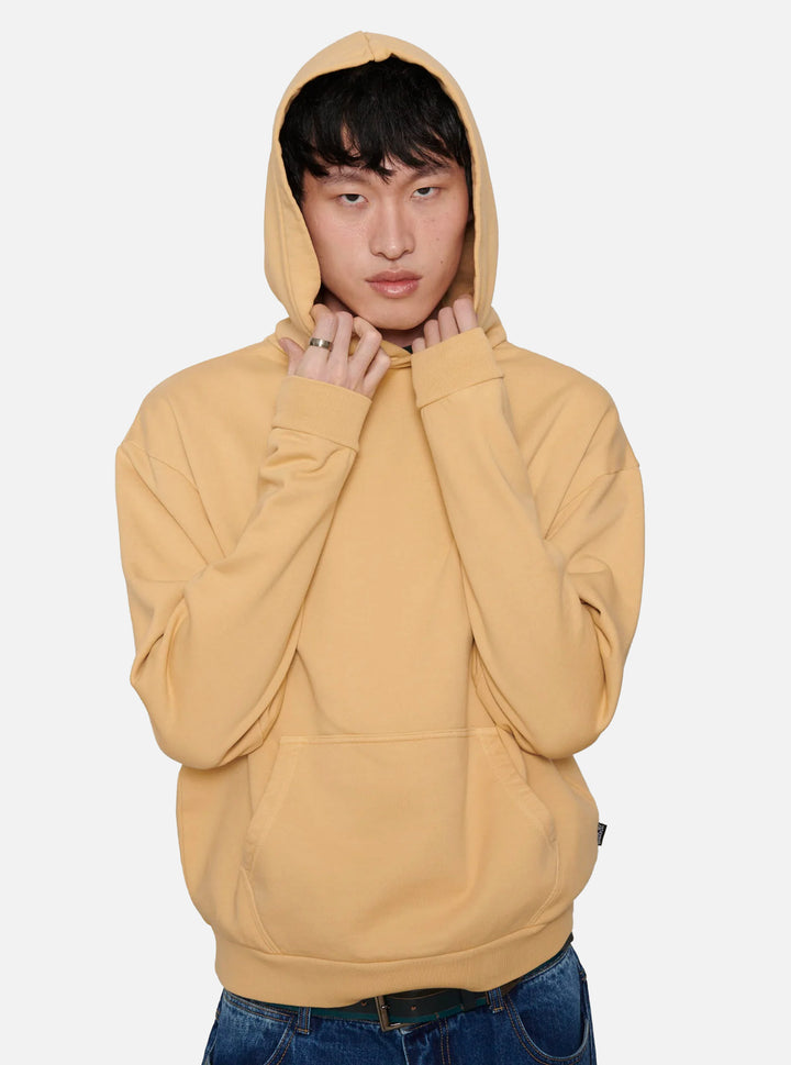 Beige. Bolsillo tipo canguro. Puños y bajo acanalados. Capucha ajustable con cordón.